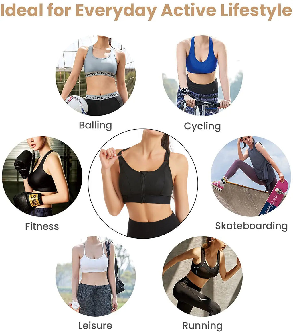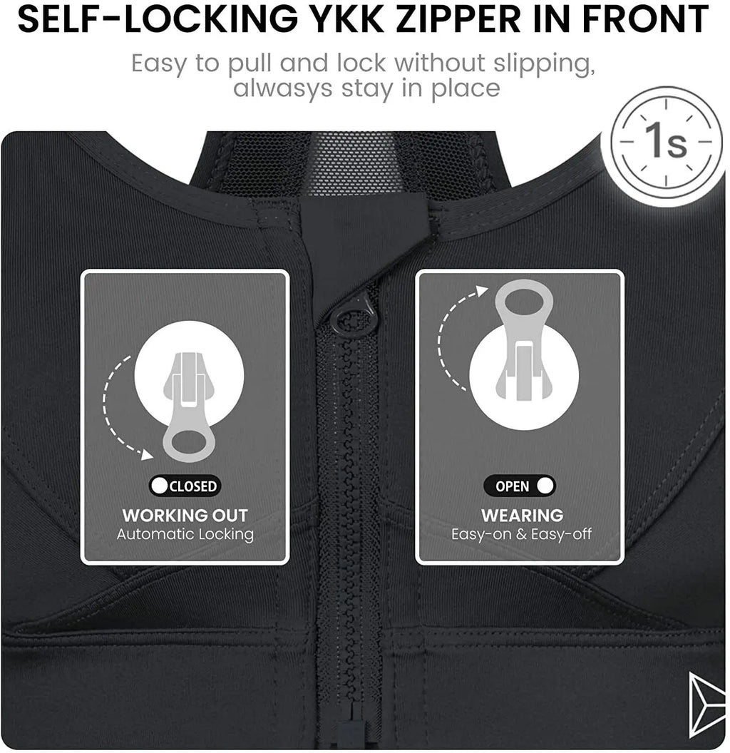 REMOVABLE PADS: Zip in front sports bra with removable padding provide supportive comfort and a customizable fit. Fit for A B C D cup for small chest or large busts / breasts. Double layer full coverage, wirefree for additional comfy, flat seams reduce chafing. This front closure sports bra will to be your favourite essential gym sport bra!